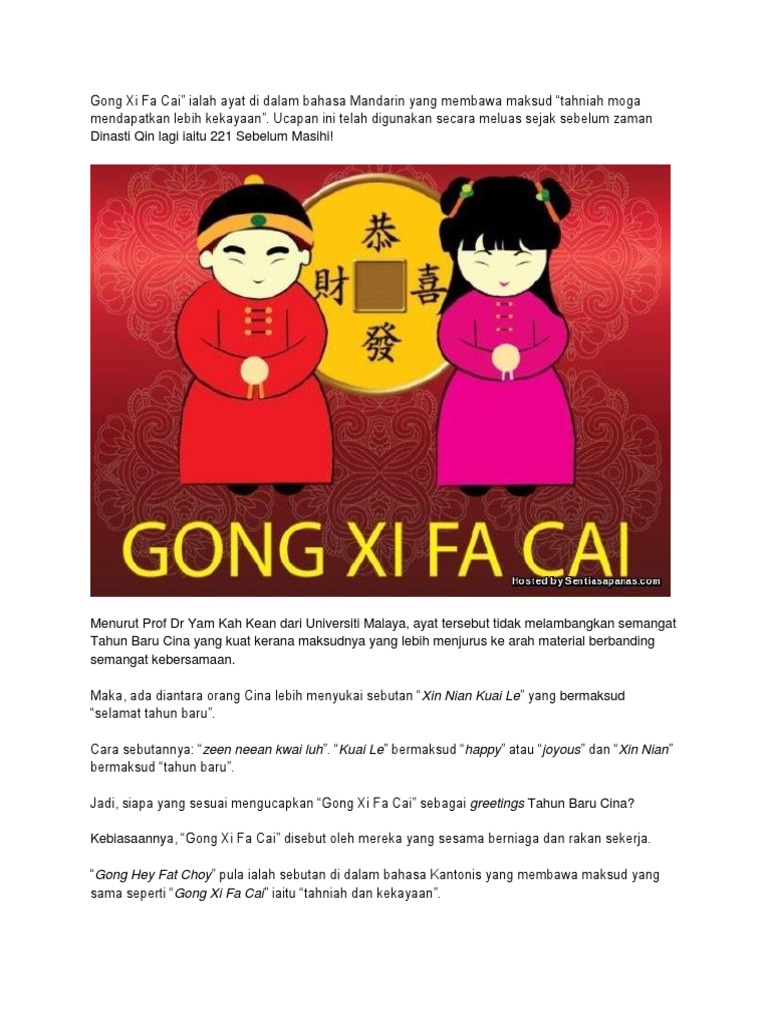. Lalu kata Fa Chai memiliki sejarah dari sebuah kesejahteraan yang seiring perkembangan zaman semakin baik di tengah masyarakat Tionghoa. Apa Maksud Gong Xi Fa CaiWah terasa lama tak menulis blogNak cakap sibuk tak lah sibuk sangatCuma semangat tu yang belum membuak-buak bagaikan letusan gunung berapiKetika mrhanafi menulis entri blog ini dah masuk hari kedua cuti Tahun Baharu Cina 2016. Saya sering mengucapkan tahniah atau Kiong Hee dalam bahasa Hokkien kepada.